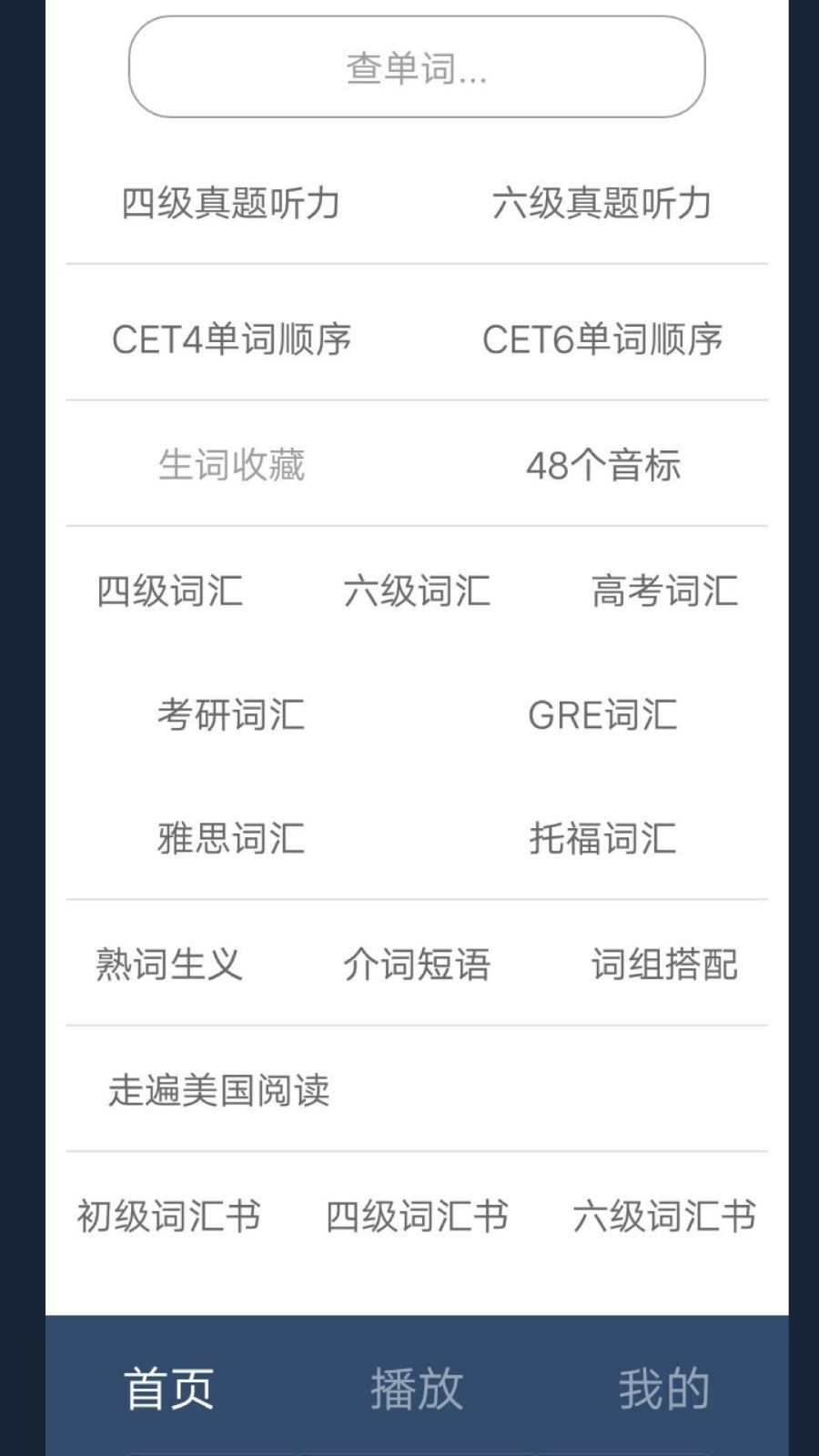 英语四级、英语六级、考研、GRE英语、雅思、托福、高考英语等单词。播放功能包含英语听力、语法、同步字幕加强记忆理解,单词测试,单词收藏,单词详情,英音、美音。