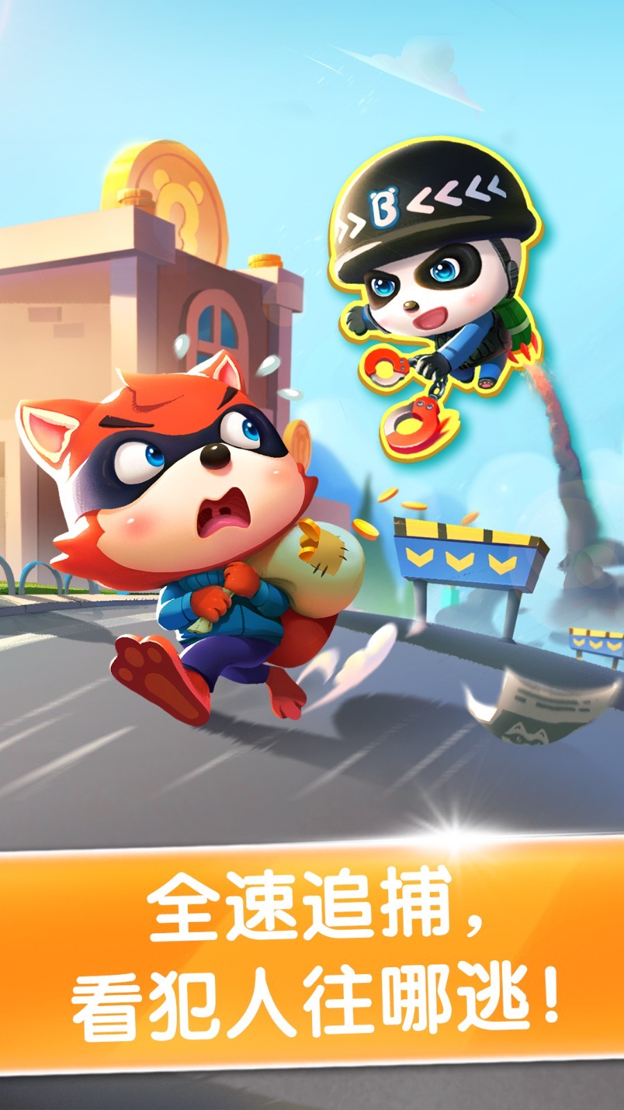 糟糕,抢劫犯正背着包从银行出来,准备逃跑!宝宝即刻下车进行追捕:火速前进、适时绕过障碍物……小心,前方设置了护栏,及时跳跃,跨过它!