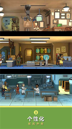 2、避难所运转起来之后,有人负责厨房(不要问哪里来的食物),也有人负责发电。至于你问到为什么没有看大门的?额,慢慢发展嘛。看到小编图中上面的标示了么,笑脸是满意度,数字是目前的人口数,其他则是电力、食物、水以及瓶盖。三样必需物资减少到了竖线位置后避难所的居民将会陷入恐慌,运转上容易出现问题,满意度也会下降。