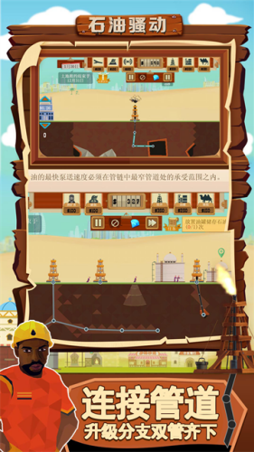 运用钻油井采油,点击管子能够加粗管子,挖油更快,管子要是遇到气矿会把管子里的石油全部喷出来,gg。管子途径气矿并不会使气矿溢出,只要节点不在气矿里就ok。升级的钻头能够钻开石头,建议到沙漠的时候尽快升级。