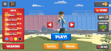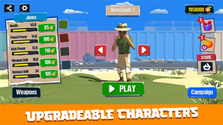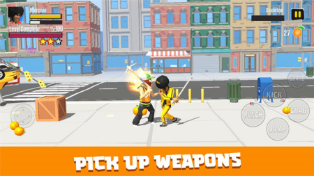 打开箱子来发现和装备新武器,吃香蕉来获得更多的力量。从歹徒那里收集橘子,解锁新战士。你可以拿起各种武器装备从地面上打击敌人。