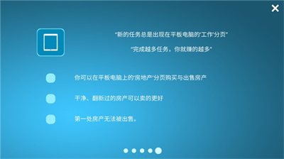 3、新的任务总是出现在平板电脑的工作分页,完成越多任务,你就赚的越多,你可以在平板电脑上的‘房地产'分页购买与出售房产,干净、翻新过的房产可以卖的更好,第一处房产无法被出售。