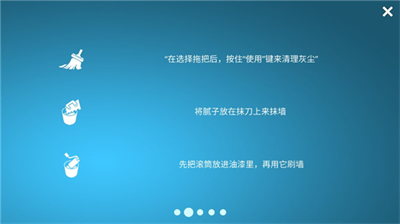 4、在选择拖把后,按住"使用"键来清理灰尘,将腻子放在抹刀上来抹墙,先把滚筒放进油漆里,再用它刷墙。