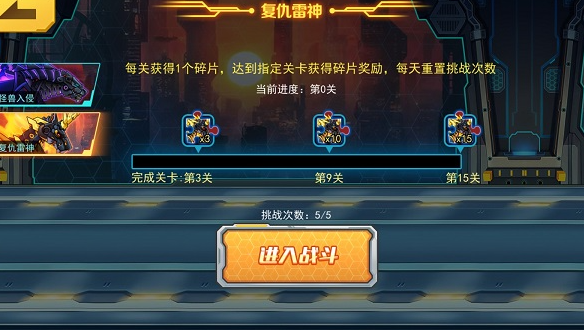 ◆ 复仇雷神:每关获得1个碎片,达到指定关卡获得碎片奖励,每天重置挑战次数。