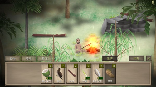 原始社会想要生存下来少不了火和食物,生火需要储备木材,而食物可以通过捕猎获得,玩家可以设置陷阱或者利用抓鱼工具,来捕得各种野味。